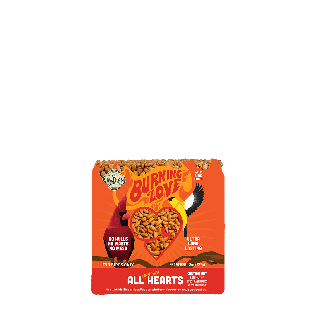 Hearts on fire! There's a lot to love about this new product! The sunflower hearts are loved by a wide variety of birds, while the Hot pepper will repel squirrels. no hulls mean no mess around your feeder. No waste, no mess, never melt. Attracts birds much more quickly than suet and without the problem of melting in the summer heat. Great for year-round bird feeding.