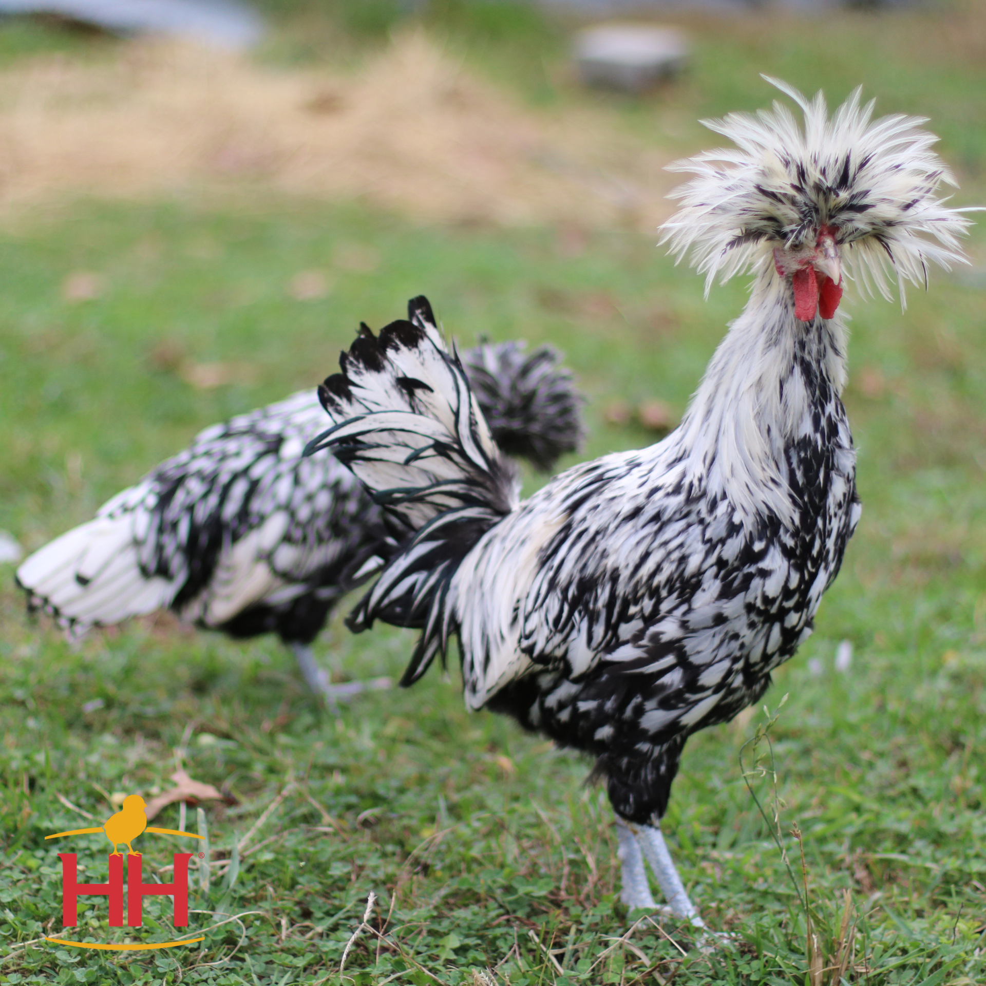 The breed is named for the Polish army's feathered caps because it resembled their feathered crests. The chickens originated in Spain and then brought to Holland, where the Dutch perfected their coloring. They became a popular bird in France, then started appearing in the U.S. around the 1830s. They are a great breed, very docile. and even-tempered. They are easily surprised due to their feathers limiting their eyesight, making them vulnerable to predators. Purpose: Ornamental Production: 100 Small White Eggs/Year Temperament: Gentle, Active Mature Weight: 4-5 lbs. Hardiness: Heat Hardy But Not Cold Hardy Broodiness: Rarely Comb Type: V Comb