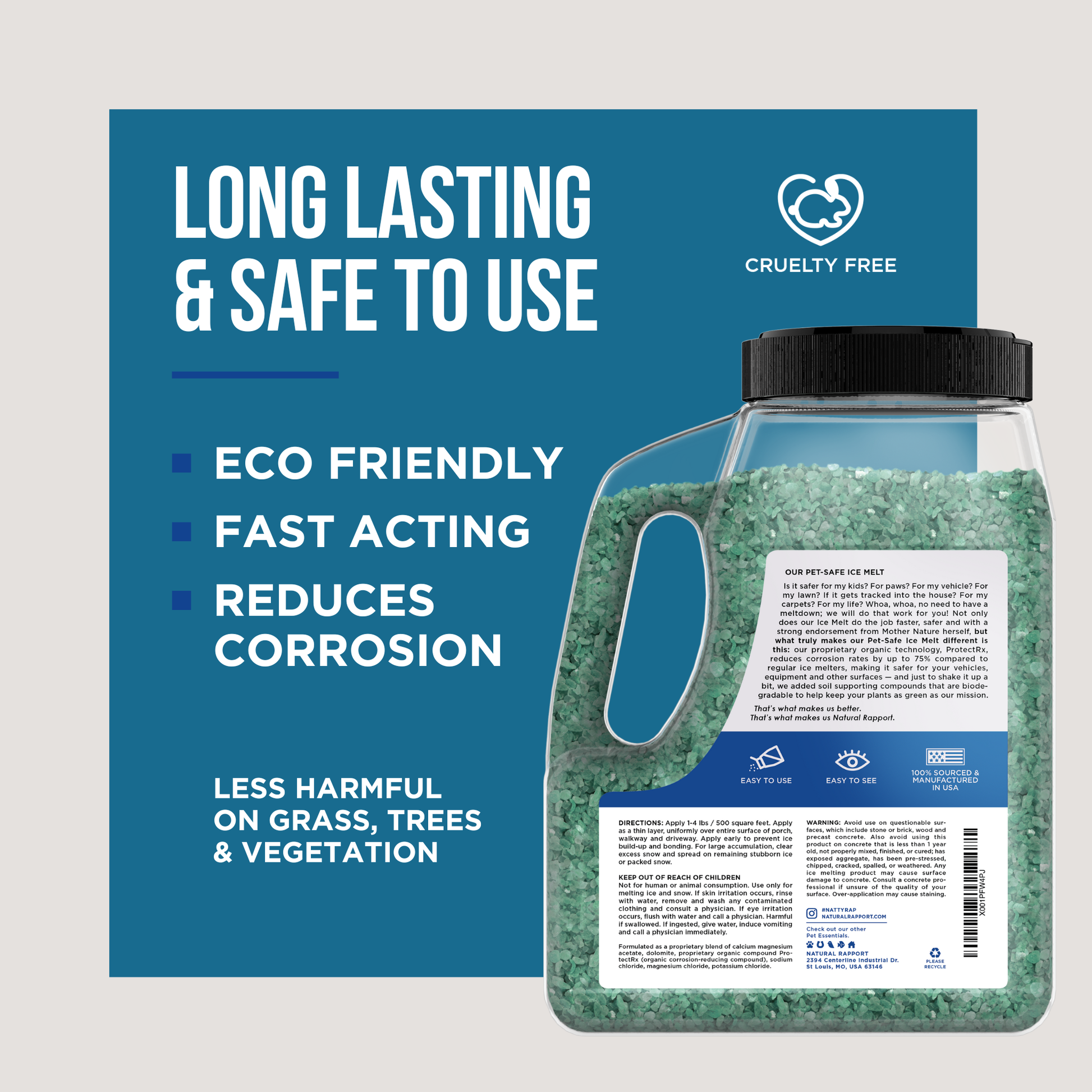 Is it safer for my kids? For paws? For my vehicle? For my lawn? If it gets tracked into the house? For my carpets? For my life? Whoa, whoa, no need to have a meltdown; we will do that work for you! Not only does our Ice Melt do the job faster, safer and with a strong endorsement from Mother Nature herself, but what truly makes our Pet-Safe Ice Melt different is this: our proprietary organic technology, ProtectRx, reduces corrosion rates by up to 75% compared to regular ice melters, making it safer for your vehicles, equipment and other surfaces — and just to shake it up a bit, we added soil supporting compounds that are biodegradable to help keep your plants as green as our mission.